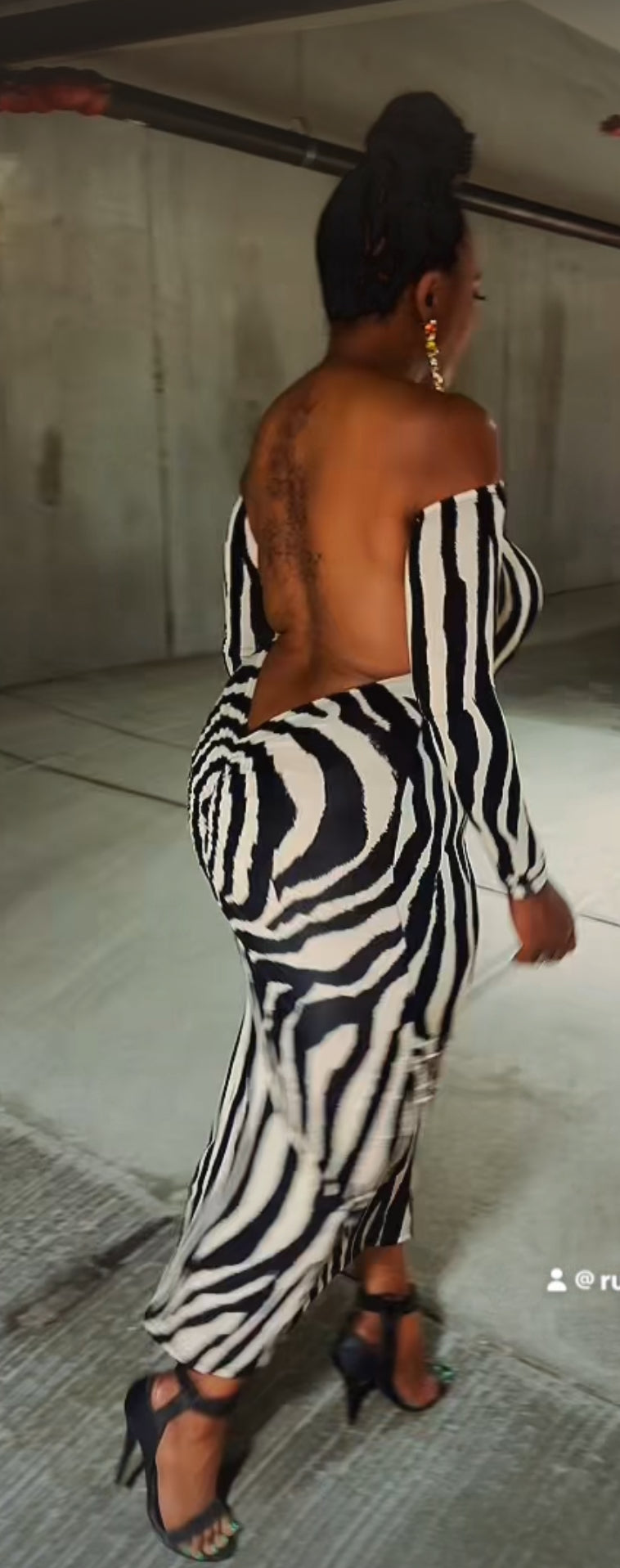 "Enhance your wardrobe with the Firestarter Dress. Featuring a stylish zebra print, this fitted dress is perfect for making a statement. The open back adds a touch of elegance and versatility. Make a bold and confident entrance with this must-have dress."Zebra print fitted dress with open back