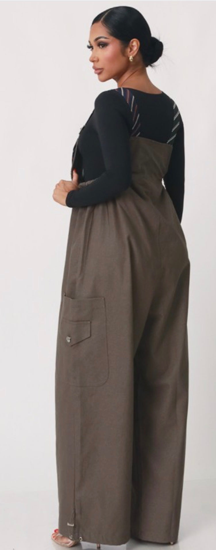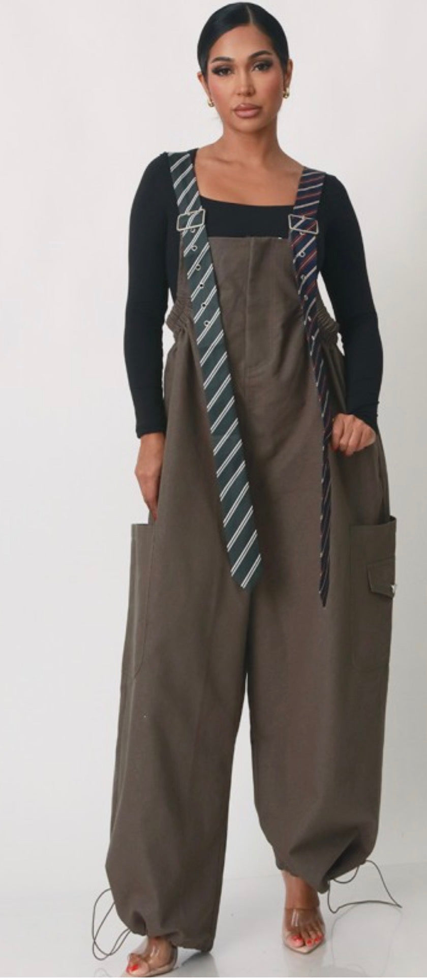 These overalls are made using a man's suit tie, providing a unique and stylish twist on a classic design. The use of high-quality materials ensures durability and a sophisticated look. Perfect for fashion-forward individuals looking to make a statement.Overalls made with men suit tie