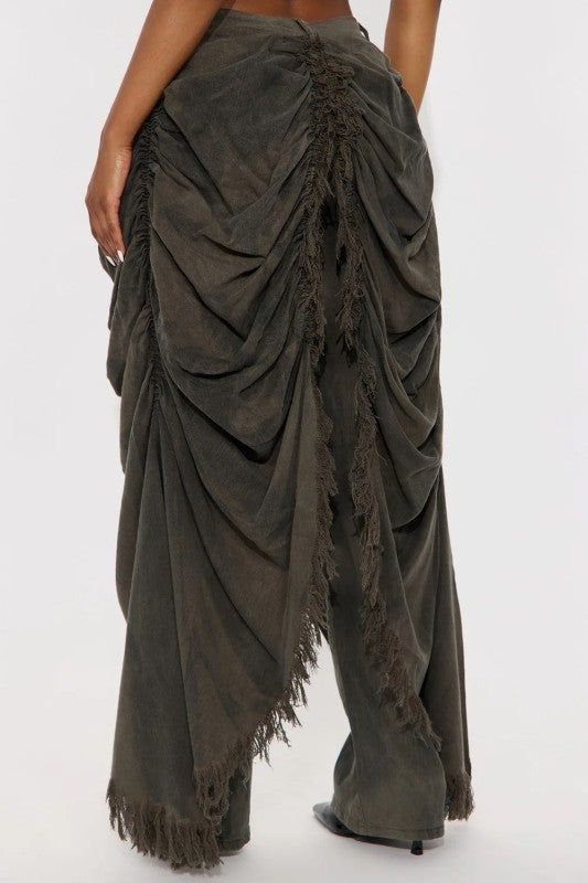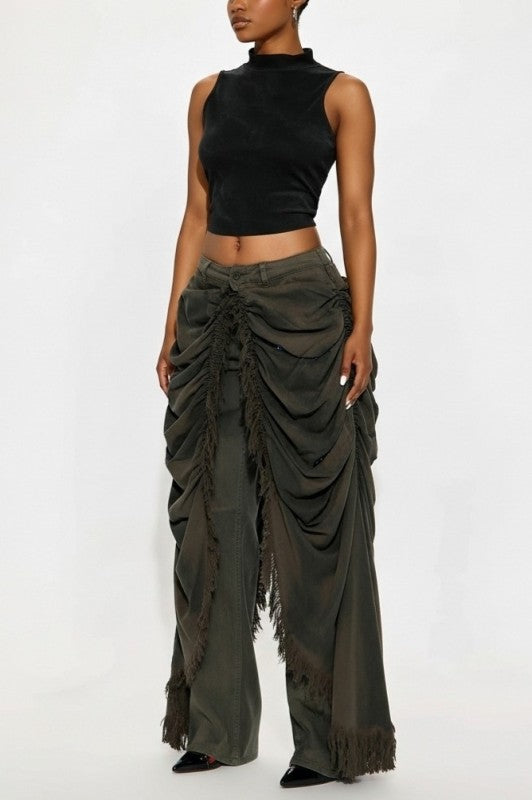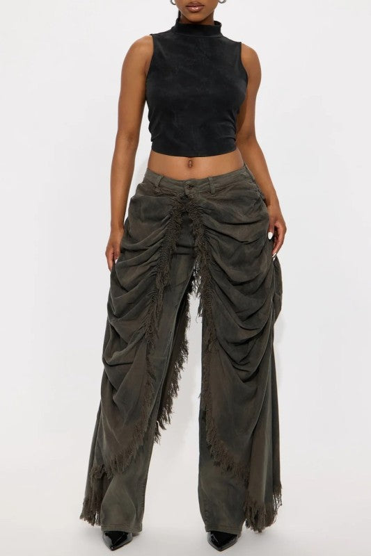 Olive washed draped jeansEnhance your style with our Olive Washed Draper Jeans. The olive wash gives these jeans a unique look while the draped hip area adds extra material for comfort and flexibility. Perfect for any occasion, these jeans will elevate your fashion game.